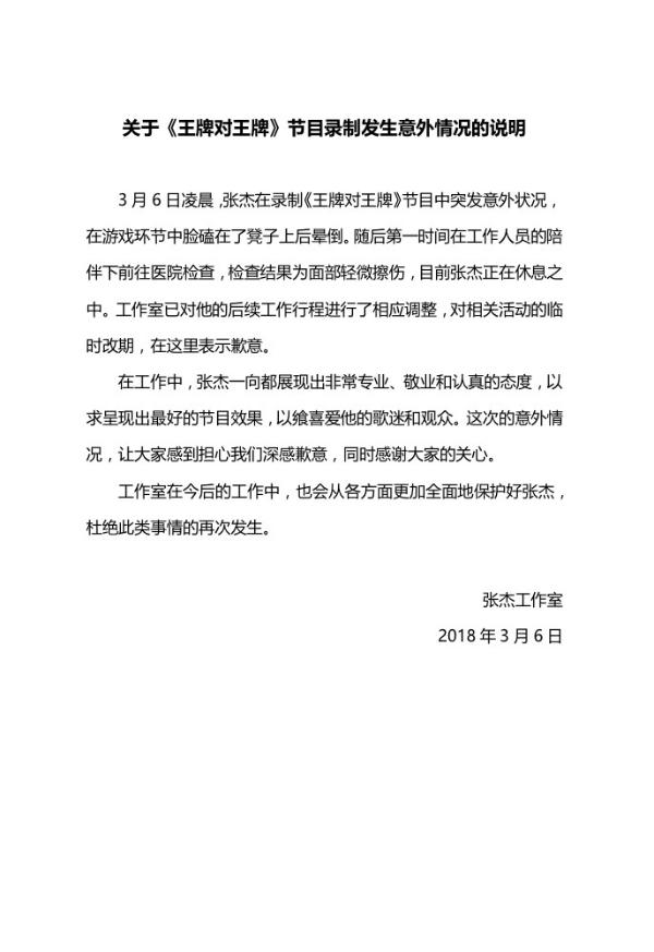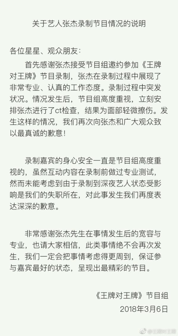 该节目组立刻安排张杰进行CT检查,鉴定为面部轻微擦伤。张杰本人在休息后第一时间发博向粉丝报平安。随后节目组也发长文向张杰表示歉意,文中提到,游戏内容做过测试,但是未能考虑到深夜录制,艺人状态受到影响,是他们的失职,并杜绝此次事件再次发生,保证让嘉宾以最好的姿态参加。