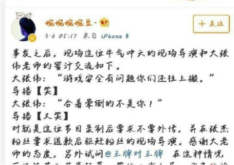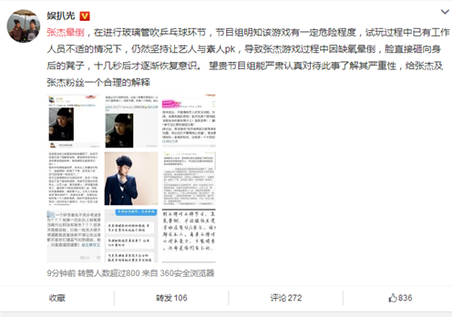 你们以为这样就结束了么,事情往往没有我们想的那么简单。根据某博主爆料,节目组明知游戏有一定的危险性,试玩的过程中就有工作人员不适的情况下仍然坚持让艺人PK,就是这个环节,嘉宾是提过意见的,但是未被节目组采纳。网友粉丝十分气愤,说节目组第一时间是封锁消息,现场的导演更是威胁的语气,网上炸锅。