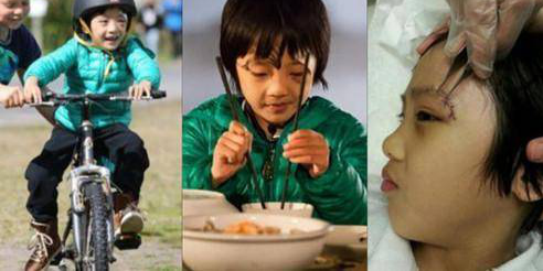 亲子真人秀《爸爸去哪儿》中,吴镇宇的爱子费曼,录制期间左眼撞伤,至今疤痕还在,结局-医院缝了十几针。
