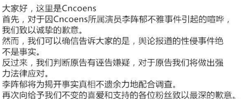 7月16日,李阵郁所属经纪公司Cncoens发布官方立场,表示性侵事件不存在。