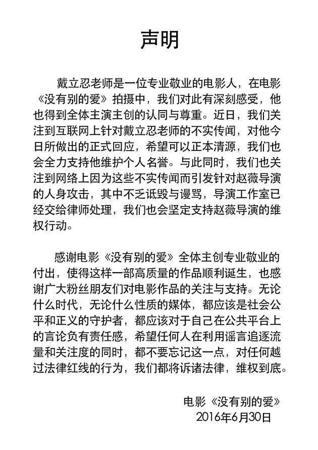 随后,在同一天,赵薇电影《没有别的爱》官方微博也发表声明,力挺戴立忍,称戴立忍是一位敬业的电影人,近日关于对戴立忍的不实传闻,希望可以正本清源,同时也权利支持他维护个人名誉。而同时对赵薇导演的人身攻击,诋毁与谩骂,导演工作室已交由律师处理,并坚定的支持赵薇的维权行动。