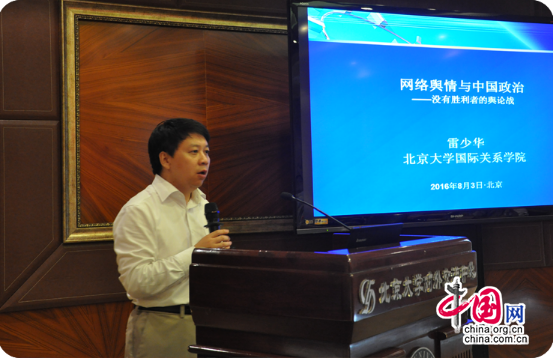 随后,北京大学国际关系学院雷少华教授进行了“网络舆情与中国政治”的主题演讲,通过对“网络舆情的平台”、“网络舆情的发展路径”、“网络舆情的热点”、“网络舆情与中国政治”等四个方面的阐述铺垫,提出了政府部门应对网络舆论的六大要点:一是建立网络舆论预警机制,及时找到网络舆情的引爆点;二是学会和舆论赛跑;三是对于恶意谣言要敢于运用法律武器;四是坦然和舆论相处,要认识到舆论是发现问题的警报器,能够促进政府相关规章制度的改进;五是要认识到舆论是激励机制,是政府部门改良自身工作的标杆;六是要认识到预防性浪费远远比事后补救“更省钱”,这更有利于重新树立食药监管局在百姓心中的地位。