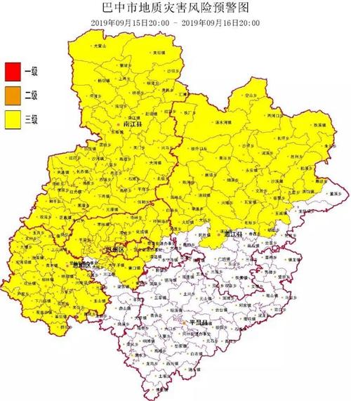 受持续降雨影响,预计15日20时至16日20时,恩阳区、经开区、南江县全域,巴州区城区、平梁、枣林、寺岭、梓橦庙、白庙、凌云、化成、关渡、清江、大矛坪、曾口、金碑,通江县诺江、火炬、大兴、毛浴、唱歌、至诚、九层、洪口、斯波以北地区发生地质灾害的风险性较高(三级黄色预警)。